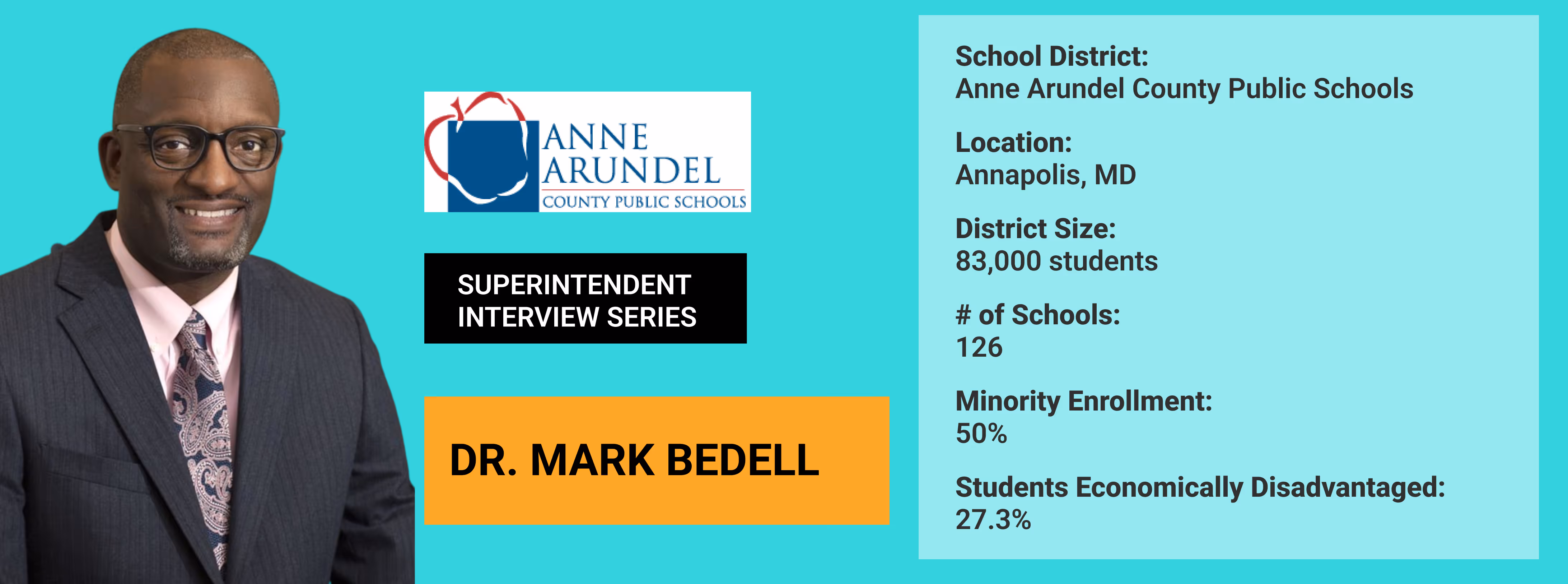 Dr. Mark Bedell is halfway through a four-year term as Superintendent of Anne Arundel County Public Schools (AACPS), Maryland’s fourth largest school district with 83,000 students across 126 schools. A career spent pushing for educational equality has earned him many accolades, including being named the 2023 Joseph E. Hill Superintendent of the Year by the National Alliance of Black School Educators. Before Maryland, Dr. Bedell spent six years as Superintendent of Kansas City Public Schools, which he returned to full accreditation status for the first time in more than 20 years.